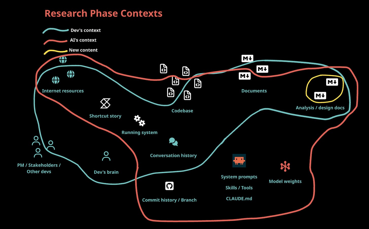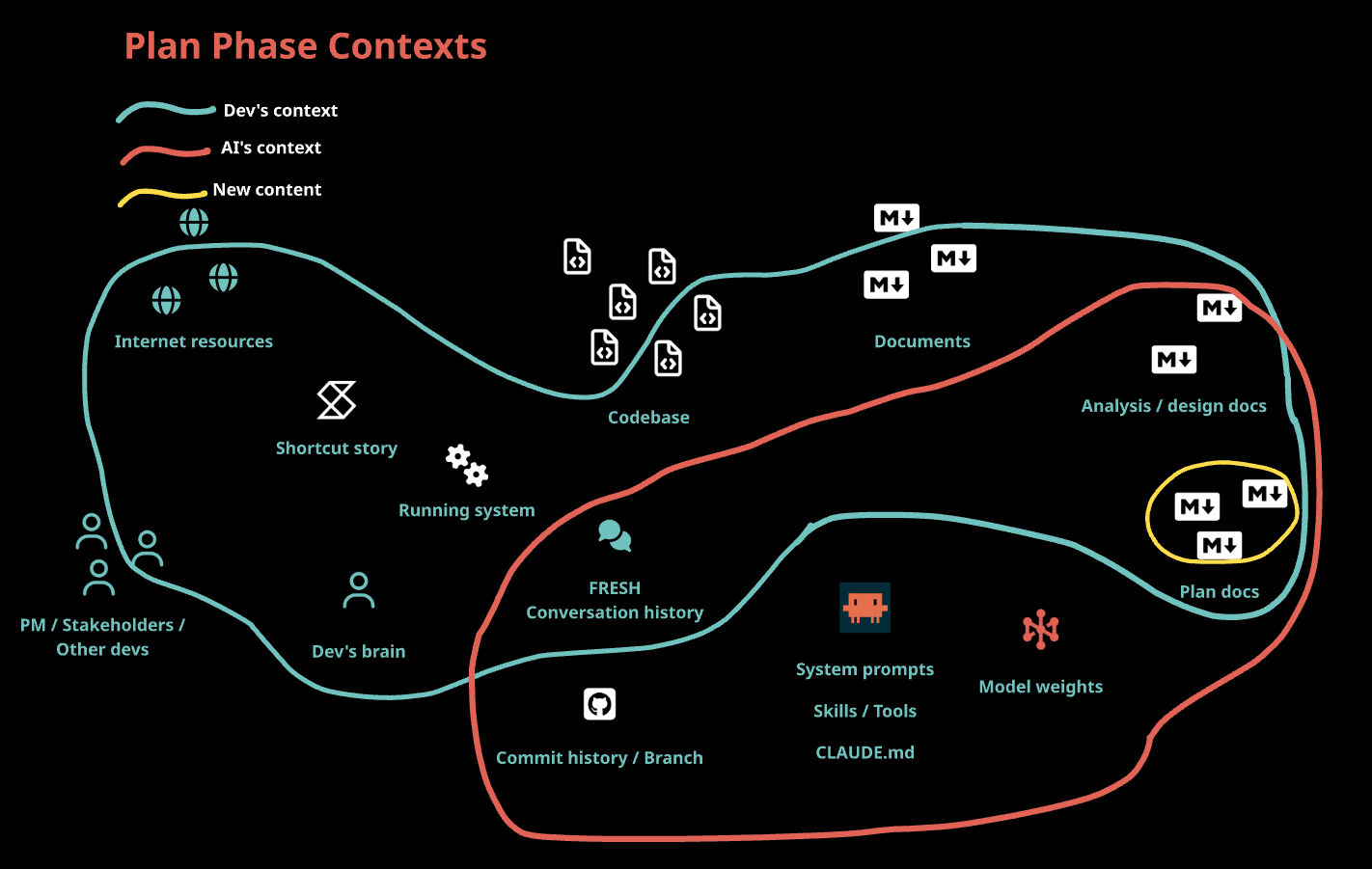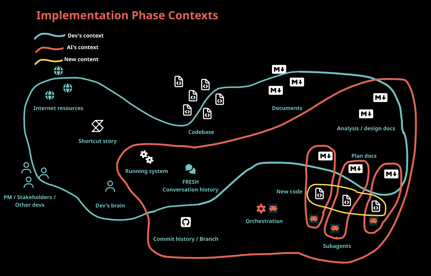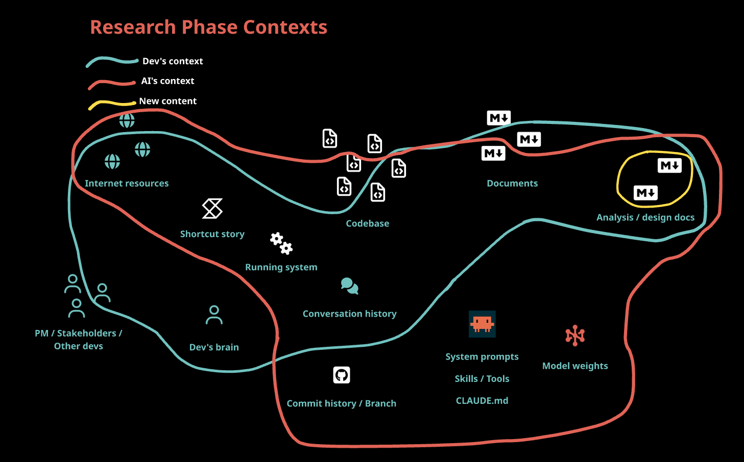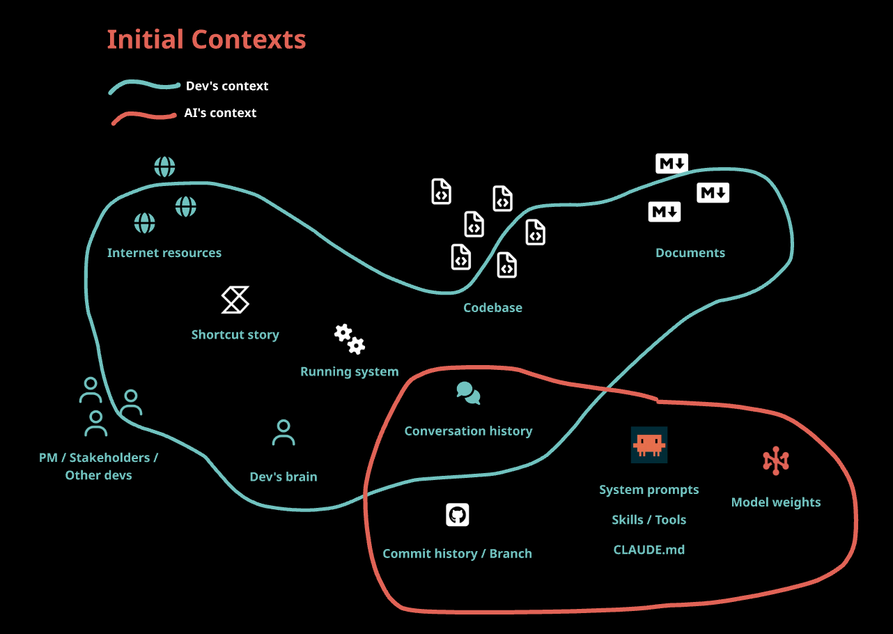 Here’s everything a dev brings to a task before any AI is involved — and here’s what the AI starts with. Notice the gap — only the conversation history is shared, the AI has no initial knowledge of the code, team conversations, backlog stories or the running system.